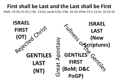 This FIRST LAST LAST FIRST is discussed in the scriptures in many places (Isa. 44:6; 48:12; Matt. 19:30; 20:16; Luke 13:30; Mark 10:31; and D&C 110:4). Then the Prophet Nephi gives a classic explanation of the significance of this grand chiasmus: